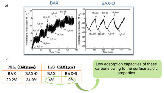 As the first challenge, gas ammonia was chosen, and the sensing abilities of polymer derived carbons were tested, and differences observed in the response were linked to the differences in ammonia interactions with the surface and its adsorption [19]. Then, extensive studies were done on wood-based carbon, BAX-1500 (Ingevity) [20]. The carbon was chosen based on its relatively high capacity to adsorb ammonia [56]. The carbon was highly porous (micro/meso), and our previous studies indicated that its relatively high surface acidity and abundance of oxygen groups on the surface attracted ammonia in a relatively high quantity [67]. To even further increase the ability of this carbon to interact with ammonia, it was mildly oxidized with HNO3. Knowing that ammonia chemically reacts with some groups of this carbon and that for a reversible sensing physical adsorption should rather be the target, the surface of both carbons, BAX and BAX-O, was initially stabilized by the exposure of the chips to ammonia until the resistance reached a constant level. Interestingly, for BAX, the normalized resistance upon exposure to NH3 increased and for BAX-O-decreased. Air purging upon exposure resulted in opposite effects and decreased 13% the normalized resistance of BAX and increased 20% that of BAX-O. That process removed physically adsorbed ammonia, and the differences in its extent were linked to the differences in porosity. As seen from Table 1, even though the oxidation of BAX decreased the overall volume of pores, it markedly increased the volume of ultramicropores (V<0.7 nm), and these pores should be the most active in physical adsorption of ammonia at ambient and dynamic conditions. After exposure to ammonia and high vacuum outgassing, the minimal changes in porosity for both carbons were recorded, suggesting that the before-porosity-measurement pretreatment (heating at 120 °C and high vacuum) removed the majority of ammonia either chemisorbed and/or physisorbed on the surface.