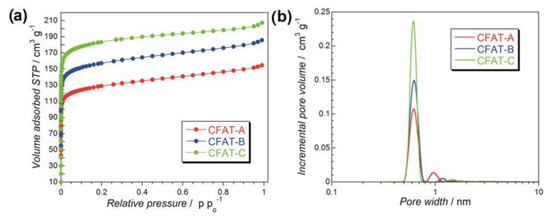 Following the applications of modified graphene for ORR and recent findings on the importance of these materials’ surface features for this process [89,90,91], we have started to apply nanoporous carbons as oxygen reduction electrocatalysts [49,50,51,52,53,54,55,56,57]. The experiments were performed in an alkaline electrolyte. To clearly underline the effects of porosity, three hydrophobic carbons obtained from polyHIPE (polymerized high internal phase emulsion) and containing micropores of the same sizes but differed in their volumes were chosen [53]. They were referred to as CFAT-A, -B, and -C, and the volume of ultramicropores increased from A to C, as seen in Figure 7. All samples, in spite of ~9 at % of oxygen were found hydrophobic with ethers as predominant surface groups.