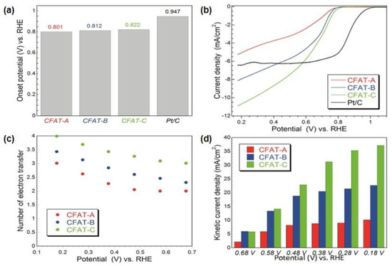 For the materials studied: (a) onset potentials; (b) linear sweep voltammograms on the modified glassy-carbon RDE in O2-saturated 0.10 MKOH at 2000 rpm and scan rate of 5 mV/s; (c) number of electron transfers versus potential; (d) kinetic current density. Reprinted with permission from Reference [53], Copyright 2016, American Chemical Society.