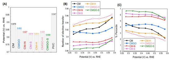 Comparison of the (A) onset potential, (B) the number of electron transfer, and (C) the percentage of oxygen reduced to peroxide. Reprinted with permission from Reference [54]. Copyright 2017, American Chemical Society.