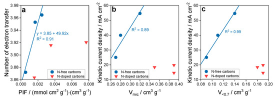 The effect of ultramicropores on ORR was also studied on another group of synthetic carbons obtained from sucrose and KIT-6 silica as a template [57]. In that case, ammonia was a nitrogen source and the samples were heated between 600 and 950 °C. Non-nitrogen modified samples were the initial one, oxidized and reduced by heat treatment at 950 °C. While the treatment with ammonia practically did not affect the porosity, the nitrogen-free samples showed some differences in this quantity (Figure 10). These differences and similarities were in fact reflected in the parameters describing the efficiency of the ORR process. Both, the number of electron transfer and onset potential were more favorable on the non-N-modified samples. Knowing that (1) ultramicropores, even though very important, do not exist in separation from other features of the carbon surface, and that (2) their hydrophobicity would be totally useless to attract and adsorb oxygen when an aqueous electrolyte with dissolved oxygen would not be able to reach them, we assumed an expanded level of the complexity of the interactions/process. To account for all of these, we proposed a Pore Influence Factor (PIF) as a product of the volume of ultramicropores and the ratio of the number dissociating groups to ECSA (electrochemically active surface area). While ECSA reflects the accessible surface to an electrolyte and the dissociating group—a hydrophilicity level in larger pores enhancing the transport of the electrolyte through the pore system, V<0.7 nm promotes an oxygen withdrawal and adsorption and then reduction. The analysis of the dependence of the number of electron transfer on PIF is presented in Figure 10 where a linear tend was found for the non-N-modified samples. For those treated with ammonia, no relationship was uncovered since the samples were very similar in all aspects and also behaved similarly in ORR. The linear dependence of the kinetic current density of the non-N-modified samples of Vmic and V<0.7 (volume of micropores and pores smaller than 0.7 nm, respectively) was also found with the stronger affect for the latter pore sizes. This further stresses the importance of the oxygen adsorption forces in these pores.