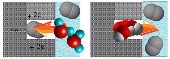 To further study CO2 electoreduction on nanoporous carbons, we used a variety of commercial and lab synthesized structurally and chemically heterogeneous catalysts [45,46]. Generally, a modification with nitrogen and surface electroreduction increased the Faradaic efficiency for both carbon monoxide and methane formation (Figure 5, left panel). CH4 was formed on all porous catalysts although a direct relationship between the amount of CH4 formed and porosity (volume or sizes) was not found. On the other hand, the results indicated the linear relationship between the amount CH4 formed and that of CO suggesting that the formation of CO is an intermediate step for that of CH4, which indeed follows our hypothesis on the pore-mediated pseudo-Fischer–Tropsch catalytic process. That apparent lack of relationship between the porosity and the amount of CH4 formed might be caused by the important influence of heteroatom-based catalytic sites on the CO formation. Thus, the efficiency of CH4 formation is dependent, although indirectly, on the activity of the catalytic sites on the carbon surface. The visualization of the pseudocatalytic effects of pores on CO2 electroreduction and formation of methane is presented in Figure 6.
