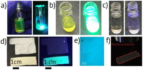 Photographs of (a) (left) as-synthesized CsPbBr3 NPs transferred to toluene and (right) dry CsPbBr3 NPs under UV lighting, (b) CsPbBr3 NPs in BA under (left) fluorescent and (right) UV lighting, (c) CsPbBr3 NPs in 1:1 BA/DMF solution under (left) fluorescent and (right) UV lighting, (d) nonwoven mats (up) without and (down) with recrystallized CsPbBr3 NPs (left) in the daylight and (right) under UV lighting, (e) PL image of nonwoven mats, (f) IR to visible light up-conversion by CsPbBr3 NPs in nonwoven mat, dash line marks the studied sample.