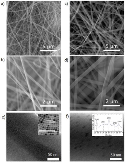 As one can see from the SEM images presented in Figure 2a–d, the mats consisted of ~200 nm thick fibers. No pronounced microscopic morphology changes were induced by the presence of the perovskite particles in the fibers. The TEM images of nonwoven fibers (Figure 2f) demonstrated inclusions with an average diameter of around 10 nm in comparison with the reference fibers (Figure 2e) without any visible features. The inset in Figure 2e shows a TEM image of dried colloid NPs with an average diameter of about 9.8 nm with a standard deviation of 1.8 nm.