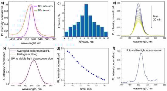 (a) Normalized spectra of NPs in a toluene solution (violet line) and in a nonwoven mat (orange line). (b) Averaged down-conversion PL intensity and its fitting by signal of monodispersed NPs. (c) Calculated distribution for a fraction of different sizes of NPs derived from the monodisperse fitting. (d) Time evolution of down-conversion PL spectra. (e) Peak intensity decay of down-conversion PL. (f) Representative spectrum of up-conversion PL signal.