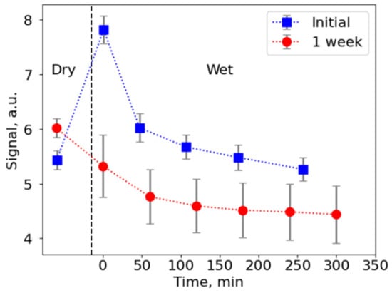 Fluorescence signal from the electrospun mats with NPs, intensity related to the initial maximum value. Two series of measurements on a single sample are shown. Upon initial immersion into water, the PL signal increases up to 44% compared to the dry mats, which can probably be attributed to scattering cancellation.