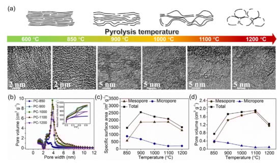 The authors concluded that the properties of the AC structures were strongly dependent on the pyrolysis temperature. At higher temperatures (1100 °C), the mesopores were closely connected with the ultrathin pore wall, and some pores even coalesced, which generated a high SSA.
