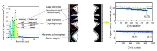 The pore structure plays a significant role in the CEs’ electrochemical properties [30,42,59]. The electrolyte ions can be efficiently transported in small-sized (<1 nm) pores, reaching high charge storage capability at low current density [60,61,62]. However, the electrolyte’s access and flow in small pores are hindered by increasing current density leading to a low ion exchange rate [63,64,65]. However, meso and macropores (pore sizes > 2 nm) give an essential contribution to the rate performance of porous CEs due to the fast transport of solvated electrolyte ions even under high current density [62,66].