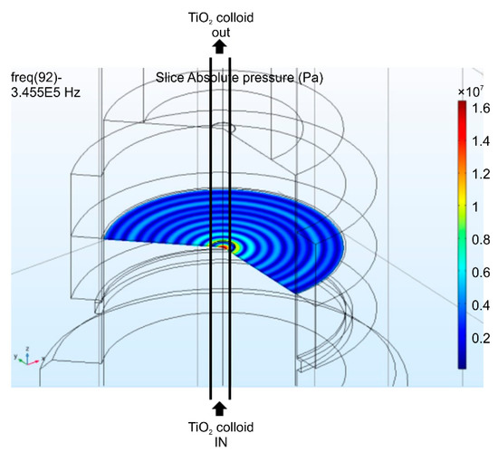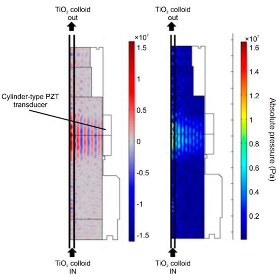 Acoustic streaming of the proposed system was simulated using the COMSOL Multiphysics software (version 4.2, COMSOL Multiphysics®, Stockholm, Sweden) [17]. The acoustic pressure gradient and the actual energy distribution pattern of the ultrasonic dispersion equipment used in this study (Figure 3) clearly depict the focused sound pressure and the sound energy distribution.