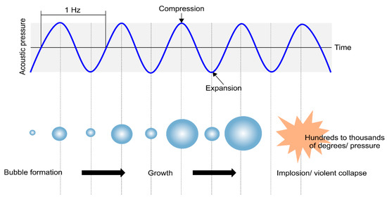 Cavitation, which is used in ultrasonic dispersion, is generated by the application of a repeated amount of sound pressure per second. An ultrasonic wave is generated, and cavitation bubbles become enlarged while the sound pressure is repeatedly applied. When the bubbles grow to the critical value, they collapse. The temperature and pressure of the generated bubbles can vary from hundreds to thousands of degrees Kelvin and atmospheres, respectively. The temperature and atmospheric pressure generated during bubble collapse are referred to as the collapse power, and their values vary depending on the given frequency, ultrasonic irradiation time, temperature, medium type, and voltage. Figure 5 shows a schematic of the process of bubble generation and collapse during ultrasonic irradiation in a liquid medium. Ultrasonic waves irradiated through the liquid medium produce compressive and tensile stresses that cause the microbubbles to shrink and expand, respectively.