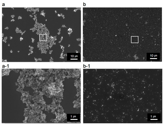 SEM images before (a) and after (b) ultrasonic dispersion. (a-1) and (b-1) represent the magnified images of the regions marked in white boxes in (a) and (b), respectively.