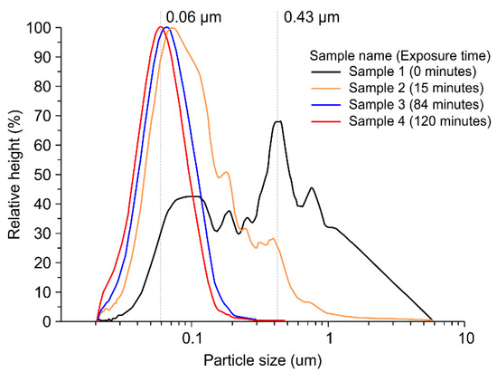 Particle size and size distributions of TiO2 particles for different ultrasonic exposure times (samples 1 (black, 0 min), 2 (yellow, 15 min), 3 (blue, 84 min), and 4 (red, 120 min)).