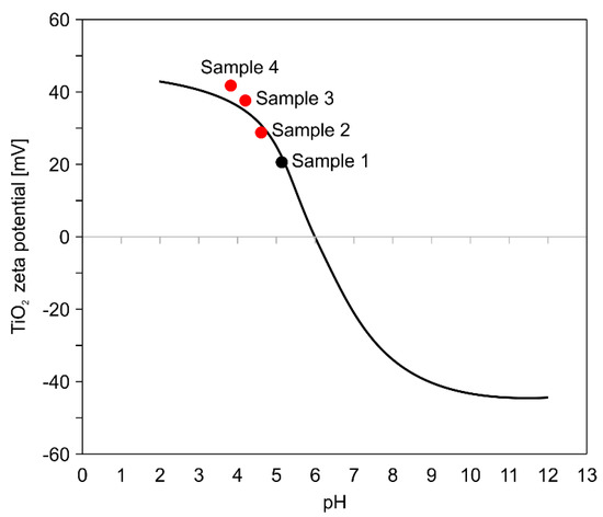 The zeta potential is a major indicator of colloidal dispersion stability. The magnitude of the zeta potential indicates the degree of electrostatic repulsion between similarly charged adjacent particles in the dispersed system. A high zeta potential will stabilize small molecules and particles; thus, a colloid with a high zeta potential can resist agglomeration. If the zeta potential is small, the attractive force can exceed the repulsive force, thereby breaking the suspension and leading to agglomeration. When the zeta potential is less than ~35 mV, cohesion or stability is generally broken, and when the potential is between ±40 and ±60 mV, the stability is evaluated to be excellent [26,27]. The curve in Figure 9 shows the relationship between the pH and zeta potential of the TiO2 colloid [28]. The four points represent the pH and zeta potentials of the colloid before and after dispersion.