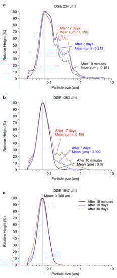 The purpose of dispersion is to obtain an extremely small and uniform hydrodynamic diameter of the particles in the colloid, while increasing the duration of its stability by preventing changes and re-agglomeration. Employing the optimal ultrasonic radiation conditions for a particular material can maximize particle dispersion; thus, it is crucial to determine the ultrasonic irradiation energy required to generate a stable state using ultrasonic dispersion. The stability of TiO2 colloids was investigated for different DSE values. The occurrence of particle re-agglomeration was determined by analyzing the particle size distribution over time. Figure 10 shows the particle size distribution of the TiO2 colloids for various DSE values, where each DSE value corresponds to a different exposure time. Figure 10a displays the particle size distribution of the TiO2 colloid at an ultrasonic exposure time of 15 min and DSE of 234 J/mL. The average particle size immediately after 10 min of ultrasonic irradiation was 0.181 μm. After seven days of ultrasonic dispersion, the particle sizes increased to between 0.2 and 1 μm. After 17 days, the average particle size was 0.296 μm, suggesting that the particle should be agglomerated. These results indicate that a dispersion time of 15 min with a DSE value of 234 J/mL is insufficient to maintain the dispersion stability of the TiO2 colloid (1 wt%). There was a significant number of sub-micron size particles in the particle size distribution immediately after dispersion, which suggests that 234 J/mL is not the DSEcr value of the TiO2 colloid (1 wt%).