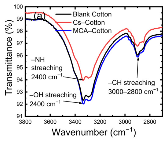 Fourier transform-infrared (FTIR) spectra of unmodified cotton gauze (blank), carboxymethylated cotton gauze (MCA-Cotton), and cotton gauze modified with cationic chitosan (Cs-Cotton): (a) spectra from 3800 to 2700 cm−1, (b) spectra from 1700 to 1200 cm−1, and (c) spectra from 1200 to 500 cm−1.