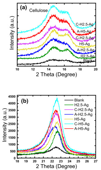 Cotton gauze samples modified with Cs and coated with HAp and Ag NPs (C-H2.5-Ag and C-H5-Ag) showed the highest peak intensity at 22.8° (Figure 5b) compared with the unmodified cotton gauze (blank) and the samples with anionic modification (carboxymethylation) (H2.5-Ag, H5-Ag) in which the main peaks also were slightly shifted to higher lower angles. A slight shift was observed for the A-H2.5-Ag sample (cotton gauze with anionic modification and coated with HAp and Ag NPs). Similarly, the samples modified with Cs and coated with HAp and Ag NPs (C-H2.5-Ag and C-H5-Ag) displayed the highest intensity for the peaks corresponding to the cellulose crystalline structure at 14.8° and 16.3° (Figure 5a).