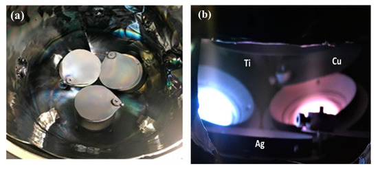 (a) Physical vapor deposition (PVD) chamber of three tilted metallic targets with respect to the substrate holder, and (b) targets ignite during sputtering.