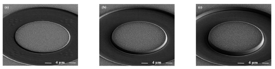 The residual stress measurements were carried out by the focused ion beam and digital image correlation (FIB-DIC) micro-ring core method on a FEI Helios Nanolab 600 dual beam focused ion beam scanning electron microscope (FIB/SEM, Thermo Fisher Scientific, Waltham, MA, USA), using a specifically developed automated procedure [47]. The milling was performed using an annular trench with an inner diameter of 6.5 μm while employing a current of 0.92 nA at the acceleration voltage of 30 kV. Ten high resolution secondary electron images were acquired before and after each milling step using an integral of 128 images at a dwell time of 50 ns. The automatic procedure continuously monitored and corrected electron and ion beam drift while maintaining the same contrast of the reference image. The milling was performed until the h/D ratio of 0.2 was achieved, where h and D represent the milling depth and the pillar diameter, respectively. The h/D ratio of 0.2 ensures an optimal strain relief, as demonstrated in number of recent publications [48,49,50]. After the milling cycle, all images were processed with a customized MATLAB v2.1.0.0 based DIC code [51] to calculate the relaxation strain over the pillar. Assuming an equi-biaxial stress distribution in the thin film, which is more than reasonable in the case of PVD films on flat substrates, average stress in the film was calculated by using the interpolated relaxation strain at h/D = 0.2, elastic modulus (E), and Poisson’s ratio (ν) according to the following equation [52]: