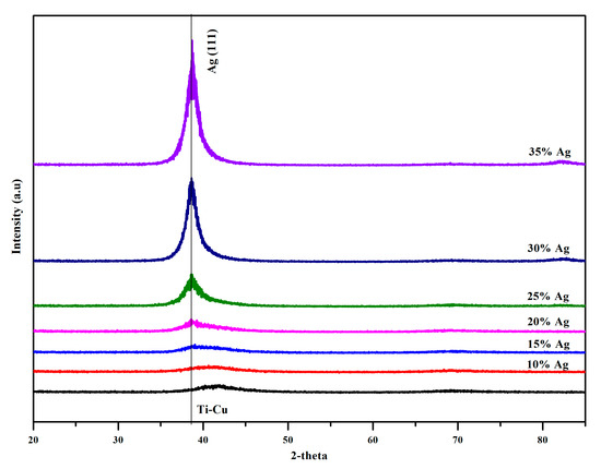 While the structure of the Ti-Cu-Ag composite thin films with the Ag content lower than 25 at.% remains amorphous similar to the binary Ti-Cu thin film (Figure 3), a more pronounced diffraction peak was observed for the ternary Ti-Cu-Ag thin films with the Ag content varying from 25 to 35 at.% reflecting their nanocrystalline structure. The full width at half maximum (FWHM) of the diffraction peak is obviously higher for the binary Ti-Cu thin films than for the composite Ti-Cu-Ag thin films and decreased when the Ag content increased. This feature may reflect a more ordered structure of the Ti-Cu-Ag thin films than that of the Ti-Cu thin films especially for the Ag contents higher than 25 at.%. Therefore, the Ag content of ~25 at.% was identified as a critical threshold for the transition from an amorphous to a crystalline structure of Ti-Cu-Ag system.