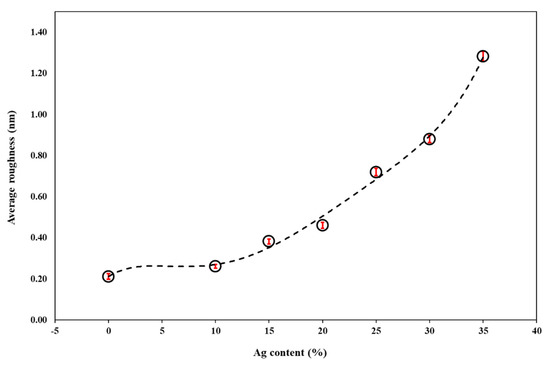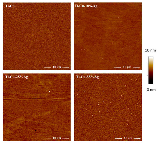 The surface average roughness Ra of the Ti-Cu-Ag thin films with a varying Ag content determined by AFM is shown in Figure 4. The AFM images reveal crack-free smooth surfaces for all thin films with an increase in roughness as the Ag content increases from 10 to 35 at.%.