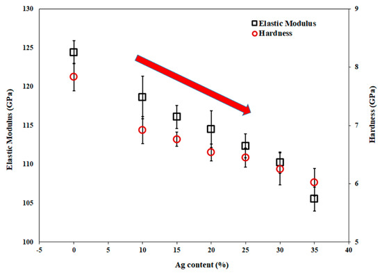 Thin films for the biomedical applications must have a high mechanical stability to insure their durability in service. The elastic modulus (E) and hardness (H) of Ti-Cu-Ag thin films as a function of the Ag content are shown in Figure 6. The highest E and H values of 124.50 GPa and 7.85 GPa, respectively, exhibit the Ag free Ti-Cu thin film. There is a slight decrease in both modulus (118.6 GPa) and hardness (7 GPa) with the addition of silver into the Ti-Cu thin films. With the first addition of 10 at.% Ag, it shows 5% decrease in modulus and 10% decrease in hardness. The phase changes from amorphous to partially crystalline at 25 at.% Ag and changes to completely crystalline with 35 at.% Ag, which causes the decrease in mechanical properties. At threshold phase change point of 25 at.% Ag, there is a decrease of 10% in modulus and 18% in hardness which is almost two times lower than controlled sample. With the further addition of Ag into the Ti-Cu thin films, both modulus and hardness continuously decrease to the lowest values of 105.5 GPa and 6 GPa for E and H, respectively, at 35 at.% of Ag in the Ti-Cu-Ag thin films. The percentage decrease in modulus is 15.6% and hardness is 23.5% for 35 at.% Ag as compared to the controlled sample. Although the nanocrystalline materials are commonly harder and stiffer due to grain boundary-related hardening [54,55], the decrease of E and H of the Ti-Cu-Ag thin films is dominated by the effect of the addition of soft Ag atoms into the thin films and may even be intensified by softening due to rotation and/or sliding of crystallites with sub-critical size [56,57].