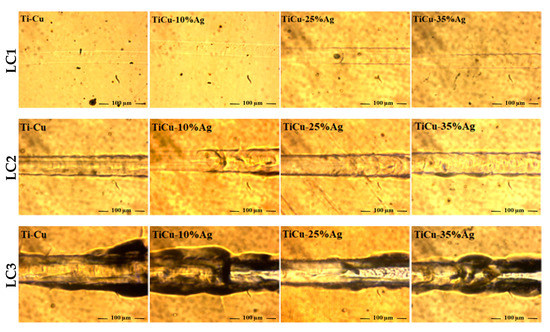 Representation of first failure LC1, second failure LC2, and complete delamination LC3 for the TiCu and TiCuAg thin films (scratch direction from left to right).