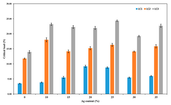 Critical load (LC1, LC2, and LC3) as a function of Ag content in the TiCu thin films.