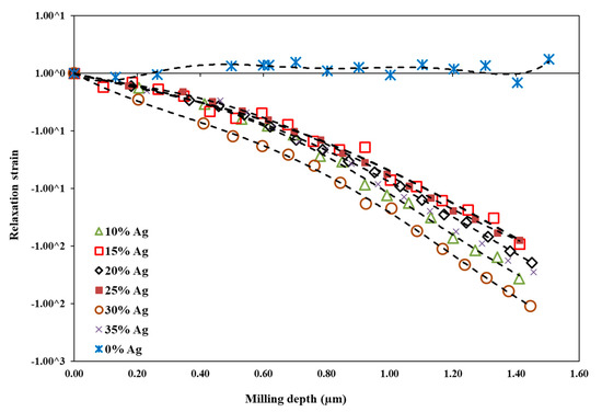 The relaxation strain determined by the focused ion beam and digital image correlation (FIB-DIC) method for Ti-Cu and Ti-Cu-Ag thin films with a various Ag content as a function of the milling depth.