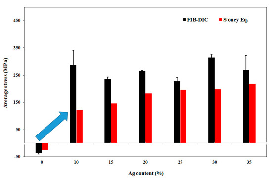 A comparison of average residual stress determined by using the FIB-DIC method and from the substrate curvature measurements is given in Figure 10. The residual stress obtained from both techniques shows a similar trend, with a clear transition from compressive to tensile stress in the thin films after the addition of silver. The Ti-Cu thin film exhibits compressive residual stress of −36.5 MPa and tensile stresses ranging from 228.5–314 MPa developed in the thin films after the addition of silver from 10–35 at.%. It is noteworthy that the values calculated by FIB-DIC are roughly 35% higher than the values obtained by the substrate curvature method according to the Stoney’s equation. This difference in the stress values determined from those two methods was already observed in our recent work and related to the difference of the representative volume element (RVE) in the two cases [48]. The curvature method takes into consideration the whole volume of the sample which can also include the stress relaxation effects associated with the microdefects and interfaces. On the other hand, FIB-DIC measures only a few cubic micrometers of the material that does not consider relaxation effects related to micro-cracks. Another important point to consider is that the wafer curvature method only takes into consideration the biaxial elastic modulus of the substrate, while the FIB-DIC method uses both the elastic modulus and the Poisson’s ratio of the thin film and substrate for calculating the residual stress.