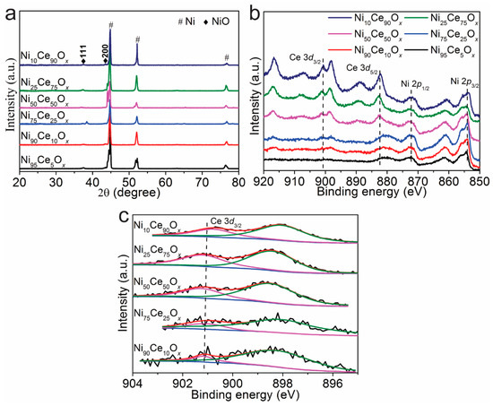 Grazing incidence XRD measurements were performed to examine the crystal structure of the NiyCe100−yOx samples, and the results are shown in Figure 2a. Only Ni and NiO related peaks were found and no CeO2 related peaks were detected for NiyCe100−yOx samples. It indicates that Ni and Ce mixed uniformly in the top layer and formed an amorphous structure. The surface element information of the NiyCe100−yOx samples was further analyzed by XPS. As shown in Figure 2b, Ce 3d peaks of CeO2 and Ni 2p peaks of NiO were observed and indicates that the deposited layers of NiyCe100−yOx catalysts are indeed composed of Ni and Ce mixed oxides. The curve fitting results of Ce 3d3/2 for NiyCe100−yOx samples are shown in Figure 2c. The peak areas of Ce 3d3/2 for Ni90Ce10Ox, Ni75Ce25Ox, Ni50Ce50Ox, Ni25Ce75Ox and Ni10Ce90Ox samples are 31.7, 55.7, 206.2, 433.0 and 603.3. For NiyCe100−yOx samples, the peak areas of Ce 3d3/2 are in proportion with the Ce content, and the higher Ce content will lead to larger peak areas of Ce 3d3/2. The sequence of the peak areas of Ce 3d3/2 of NiyCe100−yOx samples are in accordance with the Ce content in these samples (Table S1). This indicates that the designed Ni/Ce ratios remain constant for the synthesized NiyCe100−yOx samples.
