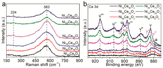 XPS was carried out on NiyCe100−yOx samples to further analyze the oxygen vacancy defects. The Ce 3d peaks of CeO2 were observed for NiyCe100−yOx samples, as shown in Figure 3b. The Ce 3d band is composed of ten individual peaks, that are labeled on Figure 3b as v, v″, v‴, u, u″, u‴, v0, v’, u0 and u’. The v, v″, v‴, u, u″ and u‴ peaks represent the 3d104f0 state of Ce4+, and the v0, v’, u0 and u’ peaks represent the 3d104f1 state of Ce3+ [13,25]. The intensities of these peaks increased with the increasing Ce content in NiyCe100−yOx samples. The concentration of Ce3+ and Ce4+ can be estimated according to the relative areas of the corresponding peaks. The major valence state of Ce was 4+, Ce3+ were also detected for NiyCe100−yOx samples. It is commonly known that the oxygen vacancy defects will be formed with the appearance of Ce3+ to maintain electrostatic balance according to Equation (1):