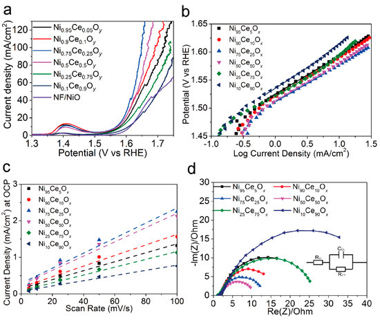 (a) Polarization curves of the NF/NiO substrate and NiyCe100−yOx catalysts for the OER with a scan rate of 10 mV/s. (b) Tafel plots obtained from the steady–state polarization curves with a scan rate of 1 mV/s. (c) Current density at OCP vs. CV scan rate for NiyCe100−yOx samples. The slope of current density at OCP vs. scan rate stands for the double–layer capacitance. (d) Nyquist plots of NiyCe100−yOx samples obtained at 1.55 V vs. RHE. The inset is the electrical equivalent circuit.