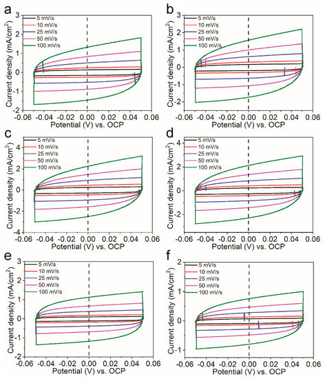 The double-layer capacitance can be used to estimate the electrochemically active surface area (ECSA) of each sample. In order to know the double-layer capacitance, we first obtained CV curves of the capacitance current in the non-Faradaic voltage region (a 0.1 V potential range centered on the OCP) for several different scan rates (Figure 5). The rate of change in the current at OCP with respect to the scan rate corresponds to the double-layer capacitance [18]. For this reason, the current at OCP was plotted against the scan rate for the NiyCe100−yOx catalysts, and a line of best fit was fitted for each catalyst’s data set, as shown in Figure 4c. The double layer capacitance was 12.3 mF, 14.5 mF, 20.6 mF, 19.5 mF, 10.7 mF, and 7.1 mF for the Ni95Ce5Ox, Ni90Ce10Ox, Ni75Ce25Ox, Ni50Ce50Ox, Ni25Ce75Ox, and Ni10Ce90Ox samples, respectively. The ECSA can be calculated according to the formula ECSA = CDL/Cs, where a specific capacitance of Cs = 0.040 mF cm−2 was used in this work [18]. The calculated ECSA values for the NiyCe100−yOx catalysts as well as other relevant electrochemistry parameters are summarized in Table 1. The ECSAs of the Ni75Ce25Ox and Ni50Ce50Ox catalysts are similar and larger than that of other NiyCe100−yOx catalysts. This is consistent with the observed current densities, as a larger ECSA means a sample has more active sites and therefore can catalyze more reactions at once and sustain a large current.