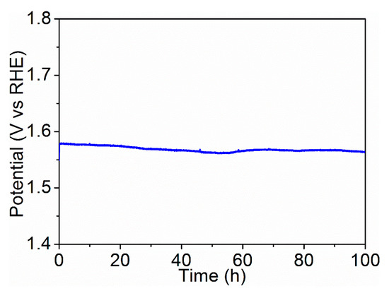 Controlled-current water electrolysis (Figure 6) was done to test the long-term performance and stability of the Ni75Ce25Ox catalyst. With a fixed current density of 10 mA/cm2, the potential remained stable at 1.57 V vs. RHE for more than 100 h. This indicates that the Ni75Ce25Ox catalyst is very stable during long-term water electrolysis.