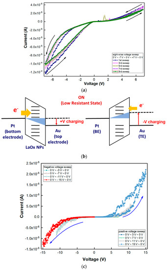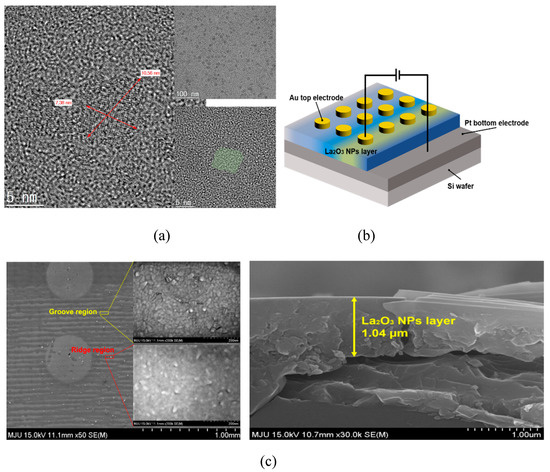 Figure 1b shows a schematic image of the Au/LaOx NPs/Pt device structure. The side shape of the LaOx NPs also was identified by the observations that the short and thick lines in