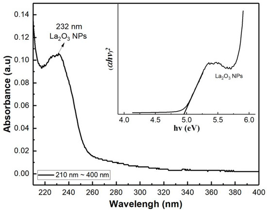 25]. The band gap was found to be 4.98 eV, where a cross-point extends the tangent of the curve and meets the horizontal axis. Since most of the metal oxide’s optical bandgap is similar to the electrical bandgap, LaO