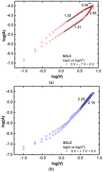 Figure 4a,b. In this analog RS condition, the resistance was instantly changed during the voltage sweep. The appearance of Ohmic conduction (