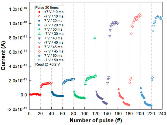 29]. The depression having a gradual increase in resistance was confirmed by repeating +7 V pulse biases or spikes 10 times with 10 ms, 20 ms, 30 ms, 40 ms, 45 ms and 50 ms width time, respectively. Then, repeating a pulse of −7 V for 10 ms, 20 ms, 30 ms, 40 ms, 45 ms, 50 ms width ten times led to an increased current level of potentiation from 0.1 nA to 0.0172 A at the read voltage of +0.2 V. The potentiation behavior showed a typical long-term potentiation (LTP) effect with increased pulse time width. Particularly, when the −7 V pulse had a 40 ms width, it was found that the current or response due to stimuli or spikes was more sharply raised than in the shorter pulse width time (10 ms, 20 ms, and 30 ms). It is believed that the LaO