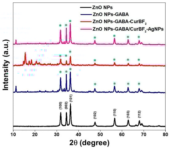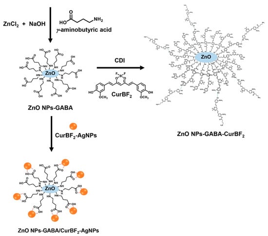 Talodthaisong C, Plaeyao K, Mongseetong C, Boonta W, Srichaiyapol O, Patramanon R, Kayunkid N, Kulchat S. The Decoration of ZnO Nanoparticles by Gamma Aminobutyric Acid, Curcumin Derivative and Silver Nanoparticles: Synthesis, Characterization and Antibacterial Evaluation. Nanomaterials. 2021; 11(2):442. https://doi.org/10.3390/nano11020442