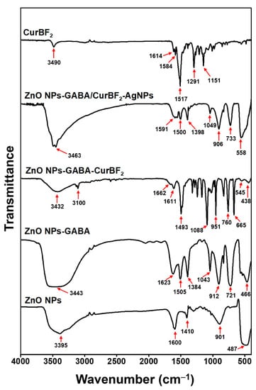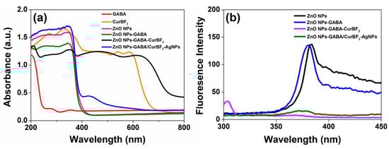 3.1. ZnO Nanoparticles Functionalization by γ-Aminobutyric Acid (GABA) and CurBF2 and the Decoration of CurBF2 on ZnO NPs