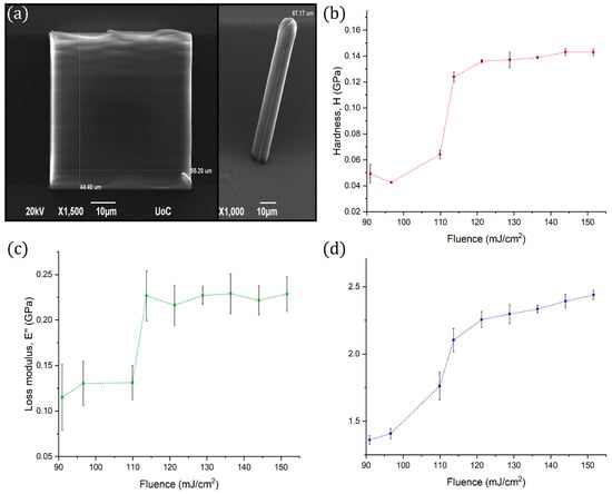 (a) SEM images of the cubes and the cylinders used for the evaluation of the mechanical properties, (b) Hardness (red line) vs. fluence, (c) Loss modulus (green line) vs. fluence, and (d) Storage modulus (blue line) vs. fluence. The abrupt change at ~110 mJ/cm2 is attributed to the printing strategy followed.
