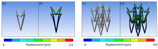 In this study, the re-entrant triangular unit cell, a thoroughly studied auxetic geometry [35], was investigated. The behaviour of the unit cell and a 2 × 2 × 2 lattice can be seen in the FEA simulations of Figure 2. All of the simulations were modelled with Ansys R18 and conducted in the linear elastic domain, using 3D–10–node tetrahedral solid elements. Specifically, the single re-entrant triangular unit cell is comprised of 5529 nodes and 2428 elements. The array is comprised of 13,532 nodes and 4536 elements. To match the loading conditions of the experimental setup, the bottom intersection of the unit cells was fixed, while the top intersections were set to a displacement of 2.0 μm and 4.0 μm, respectively. Under axial compression, lateral compression also occurs, resulting in a negative Poisson’s ratio. By measuring the maximum strain in the lateral and transverse dimensions, the ratio is close to −1 for both cases. However, it is observed that in the array there is more excessive deformation on the middle node, resulting in a more abrupt effect at the intersection of layers. Under axial compression, lateral compression also occurs, resulting in a negative Poisson’s ratio. Fabricated strutures based on this geometry could be used as tunable filters (Figure 3) and auxetic stents (Figure 4). Both structures were realised using the Nano-Cube setup with a laser fluence of 90 mJ/cm2 at 100 μm/s scanning speed. The unit cell of the filter is ~10 μm and of the stent ~5 μm. The diameter of the entire stent is ~50 μm.