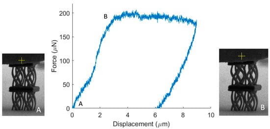 To assess the mechanical performance of the fabricated specimens, in-situ SEM microindentation experiments were conducted. A characteristic stress strain response of the re-entrant triangular is presented in Figure 6. As the structure deforms, the beam members traverse to the interior of the structure, leading to a plateau in the force-displacement curve. This deformation mode provides densification of the specimen and obstructs egregious features such as barrel shape formation, verifying the feasibility of the auxetic design. The compression of the stent-like array is presented in Figure 7. In this design, the auxetic behavior precipitates instability similar to non-linear shell buckling, as it was validated by the FEA simulations shown in Figure 7. For this simulation, a third of the structure was simulated by applying periodic boudary conditions. The structure was comprised of 53,800 nodes and 276,988 elements. To match the experiments, the bottom nodes were fixed and the top nodes were subject to a unit load. This loading condition leads to a buckling mode that demonstrates large deformation on the middle of the array, as it was also observed in the experiment. This instability lead to a drop in the force displacement curve, and contraction of the structure. For a stent mechanism that is subject to a uniform axial load on its surface, such a deformation mode must be taken into consideration, in order to obtain the correct fabrication parameters before applying it to the patient. This is an extra parameter that must be accounted for in the design of auxetic specimens and has not been highlighted before. Nevertheless, the resilience of the auxetic design to cyclic loading can countervail this additional design constraint.