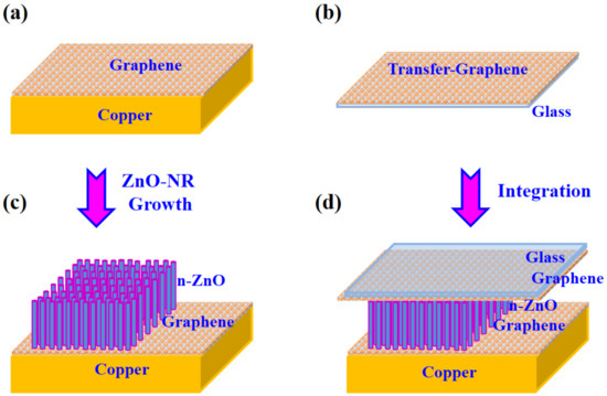 Schematic diagrams of the fabrication process for the graphene/ZnO NRs (nanorods)/graphene hybrid-structure: (a) Large-scale graphene prepared by the CVD (chemical-vapor-deposition) on Cu sheet; (b) Mono-layer graphene layer transferred to a glass substrate; (c) The ZnO NRs growth on the graphene/Cu sheet by the VPT (vapor-phase transport) method; (d) Integration of the ZnO NRs/graphene/Cu sheet with the graphene/glass substrate.