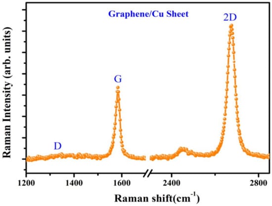 Graphene was synthesized on Cu sheet by the CVD process with a mixture of methane and hydrogen as described in detail elsewhere [25,26,27]. That is, the horizontal quartz tube (length: 2400 mm, diameter: 152 mm) was placed in the six-zone furnace (length: 1500 mm). A 25 μm-thick Cu foil (thickness: 25 μm, OFC, Alpa Aesar, 99.995%, Ward Hill, MA, USA) was loaded in the CVD chamber, which was then pumped to the base vacuum pressure (<10−4 Torr). Here, the Cu foil was vertically placed on a substrate holder in the central isothermal growth zone of the reactor during the growth process. The temperature of the chamber was ramped up to 1060 °C with a mixture of Ar (2000 sccm, 99.9999%) and H2 (30 sccm, 99.9999%) at the processing pressure of 470 mTorr. The Cu foil was typically annealed for 2 h. The furnace temperature was then decreased to the process temperature of 1020 °C with 30 sccm of H2 gas at 570 mTorr. When the furnace temperature reached 1020 °C, graphene layers started to grow on the Cu foil by the mixed gases of CH4 (40 sccm, 99.9995%) and H2 (100 sccm, 99.9999%) while flowing 2000 sccm of Ar as a carrier gas to the reaction chamber at 600 mTorr for 30 min. The reaction chamber was then cooled down to room temperature with an average rate of 14 °C/min under the same flow rates of Ar and H2 gases without methane.