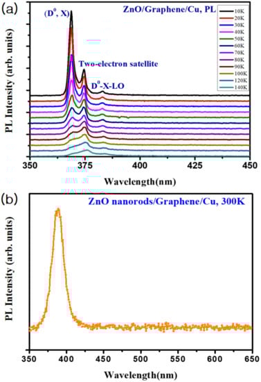 (a) Low temperature-dependent PL (photoluminescence) spectra in a temperature range of 10–140 K and (b) room-temperature PL spectrum for the ZnO NRs/graphene hybrid-nanostructure.