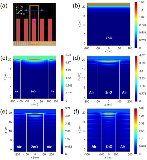 (a) The simulation structure for applying the FDTD (finite-difference time-domain) method. The electric-field intensity profiles inside the unit cell of the simulation structure for (b) 20-um thickness ZnO film and the 200-nm diameter ZnO NR arrays with an interspacing of (c) 100; (d) 200; (e) 300 and (d) 400 nm. The scale bar on the right of (b) to (f) represents the unit (V/m] of electric-field intensity.