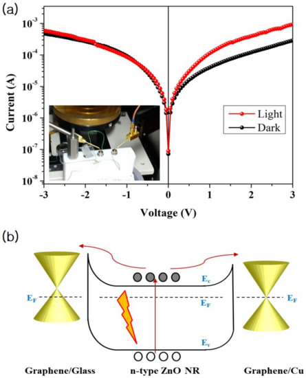 To characterize the electrical properties of the graphene/n-type ZnO NR/graphene hybrid-structure, we fabricated the device in a large scale (~cm2) without any patterning process by simply covering the ZnO NRs/graphene/Cu sheet with the graphene/glass as a top electrode as illustrated in Figure 1. Then, the photoresponse of the fabricated heterostructures was investigated through the I-V measurement under dark and illuminated conditions. Figure 7a shows I-V characteristics in linear scale of the fabricated devices under dark and 100 μW/cm2 intensities of light illumination. The inset of Figure 7a shows the optical image of the I-V measuring instrument. At dark condition, the device shows asymmetrical I-V curve due to the difference in the interface of the ZnO NRs on graphene/glass and the ZnO NRs on graphene/Cu sheet. Here, the ZnO NRs were physically contacted with the graphene/glass in a large area of ~2.2 cm2 by a pressure, while the ZnO NRs on a graphene/Cu sheet were synthesized through the VPT method. In the ZnO NRs on the graphene/Cu sheet, the graphene has an intrinsic property because the process proceeds in a high vacuum chamber in an in situ state. Meanwhile, the electrons of the graphene in the graphene/glass structure move into the oxygen atoms contained in the glass substrate (SiO2) [44], resulting in p-type doping of graphene. Therefore, energy band diagram of the graphene/n-type ZnO NRs/graphene is asymmetry as shown in Figure 7b.