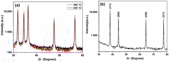 XRD pattern of (a) ZnO NP synthesized at 240 and 300 °C and (b) free-standing Ag NP.