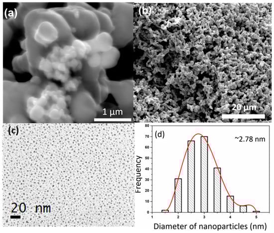 XRD patterns of the ZnO–CNT synthesized at 240 and 300 °C are provided in Figure 1a. The diffraction patterns correspond to the hexagonal wurtzite-analogous (P63mc) crystal structure (a = 3.25 Å and c = 5.20 Å). The XRD patterns show that ZnO NP are well crystallized without the presence of any secondary phases, with sizes ranging from 80 to 115 nm depending upon the temperature of synthesis [10]. Figure 1b is a typical XRD pattern of the Ag NPs used in this study. It can be clearly seen from the XRD pattern that Ag NP are single-phase and highly crystalline and only exhibit the characteristic diffraction peaks of the Ag face-centered cubic (Fm-3m) structure (JCPDS File No. 87-0720). No secondary phase structure was detected by XRD. The morphology and size distribution of Ag NP were also studied by SEM and TEM. The SEM images in Figure 2a,b illustrates that Ag NP are agglomerated. Nanoparticles smaller than 100 nm can be identified in Figure 2b, which could also be agglomerates of smaller Ag NP. TEM study was subsequently performed to confirm the size of Ag NP. The TEM micrograph presented in Figure 2c illustrates that Ag NP are spherical with an average diameter of 3 nm. The size distribution histogram in Figure 2d provides a mean nanoparticle size of 2.78 nm.